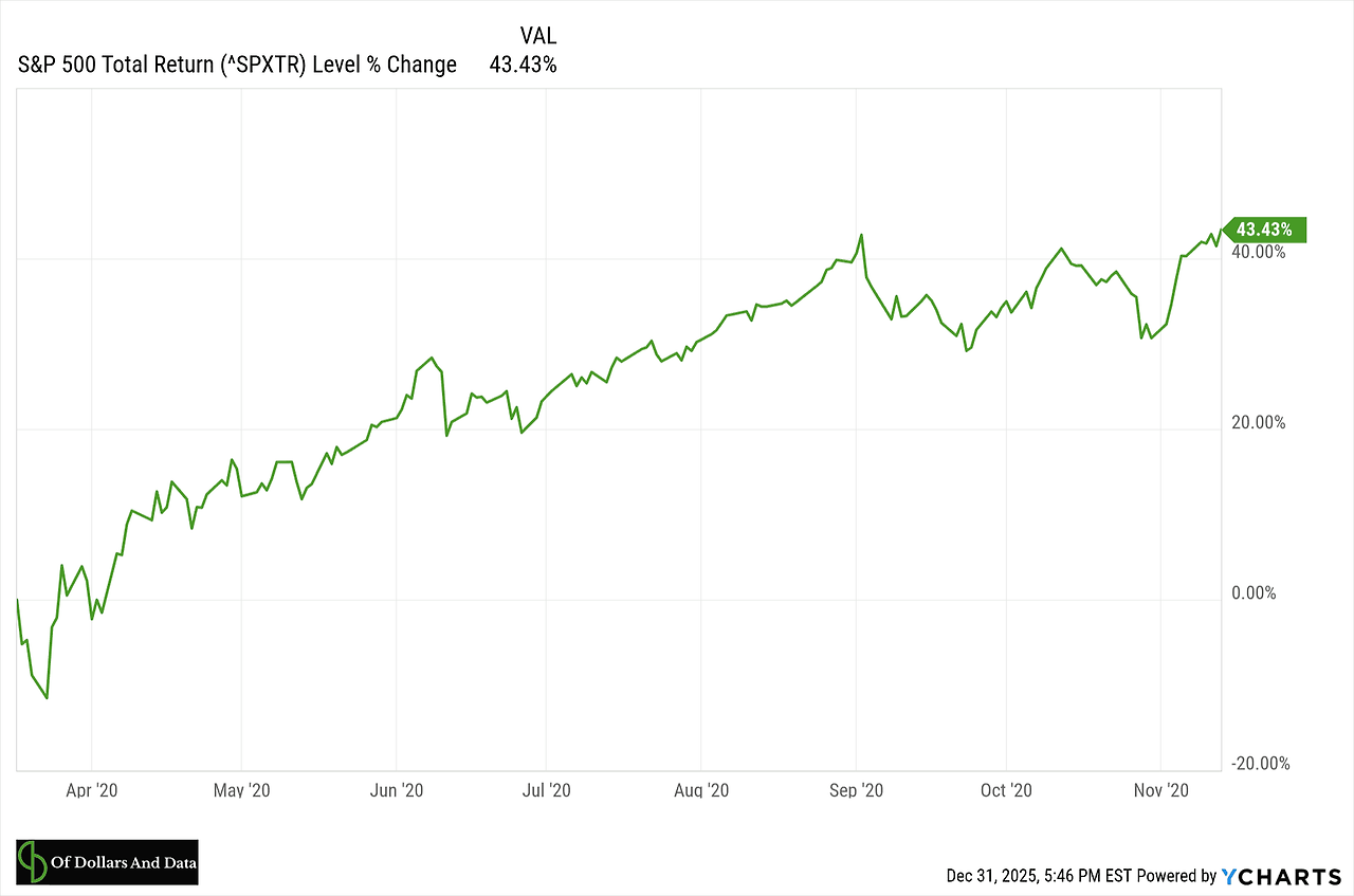 이 헤드라인을 보고 나면 백신을 발견하고 대량 생산한다는 사실에 안도하면서도 미국에서 100만 명이 넘는 사람들이 COVID-19로 사망한다는 사실에 경악할 수 있습니다. 그럼에도 불구하고 지니의 거래를 수락했으므로 돈을 재투자할 날짜를 선택해야 합니다. 위의 헤드라인만 사용하고 실제로 시장에서 일어난 일을 무시한다면 어떤 날짜를 선택하시겠습니까? 정직하게 골라 보세요. 2020년 11월 15일을 선택했을 것입니다. 그날은 초기 모더나 임상시험의 95% 효과가 발표되기 전날이었습니다. 이것이 이 헤드라인들 중에서 압도적으로 긍정적인 첫 번째 정보입니다. 그게 이상적인 선택이었나요? 아니요. 너무 늦게 재투자하면 23% 상승(2020년 2월 28일부터 2020년 11월 15일까지)을 놓쳤을 것입니다. 시장 역사를 기억하는 분들을 위해 S&P 500 지수는 2020년 3월 23일에 바닥을 찍었습니다. 따라서 위 목록의 정답은 2020년 3월 17일이었습니다. 2020년 3월 17일에 재투자했다면 2020년 11월 15일까지 43%의 수익을 올렸을 것입니다: